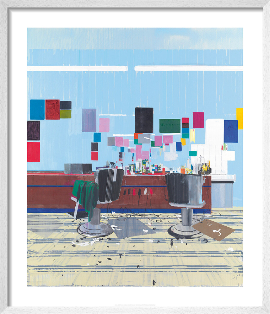 Though Anderson paints from photographs, he disrupts the figurative practice by applying abstract patterns. His paintings are representational, while exploring simultaneously the properties of surface and colour.