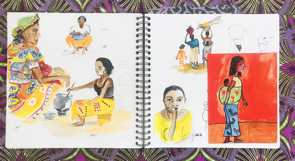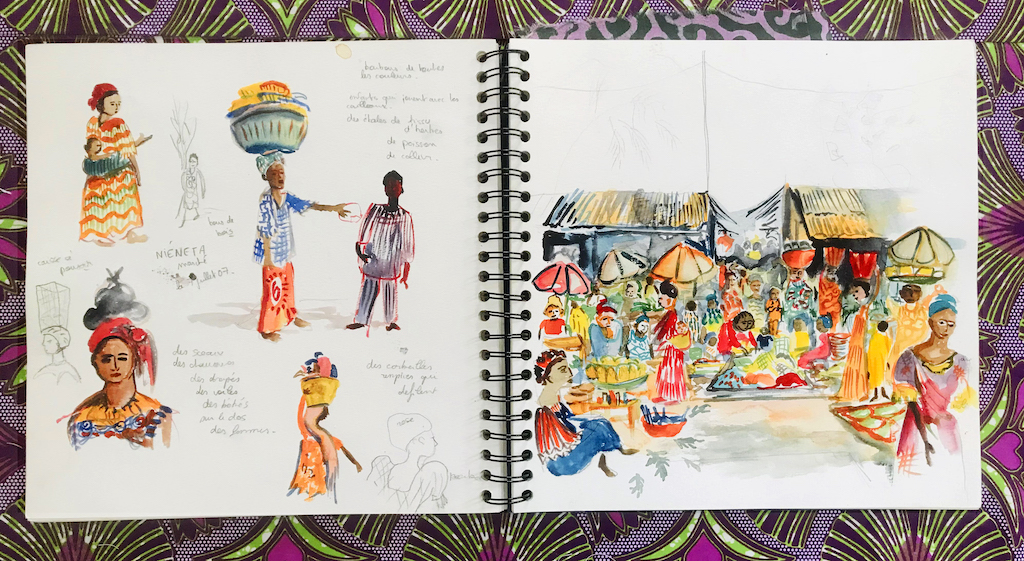A: Yes, I always have a Moleskine notebook with me and I sketch every day. I have created several travel journals which inspired my first series of paintings. I like visual note taking, watercolours, drawings or Chinese ink. I have around 50 notebooks at home.