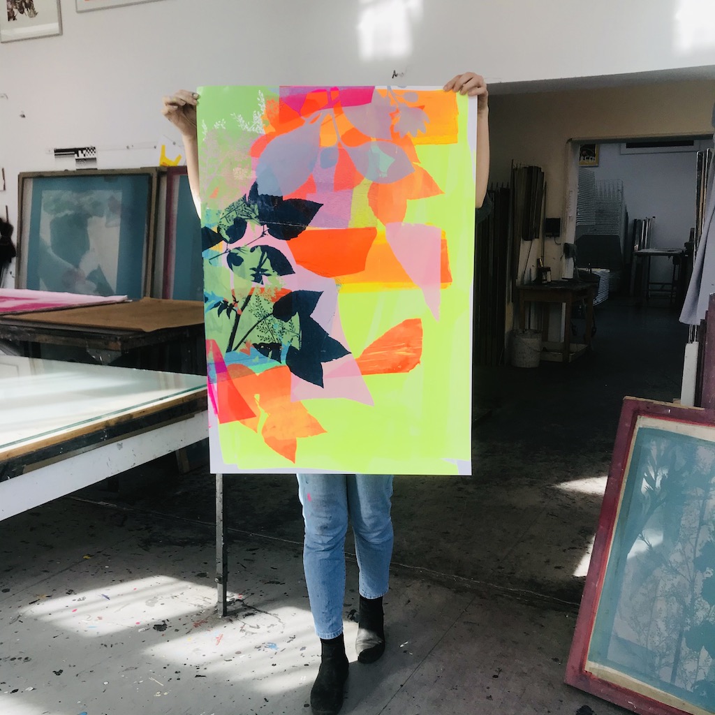 A: Floral motifs are central to my work but they evolve, both traditional and decorative, in a quest for meaning. In my latest, highly aesthetic, series the image appears through a combination of diverse techniques (photograms, monotyping, screen printing and painting).