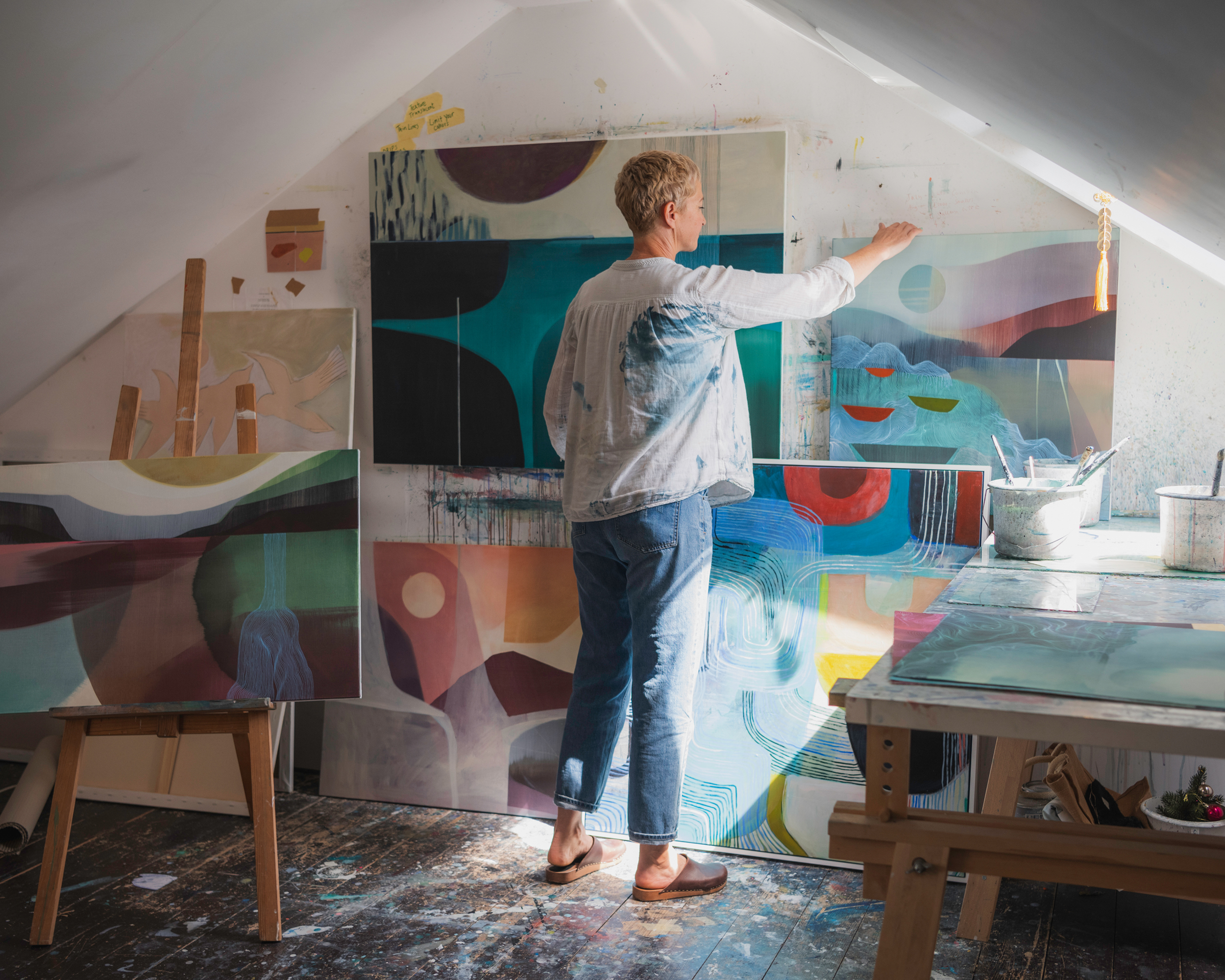 A: I paint most days. I am often working towards a new collection of work for a gallery or an art fair. I work from the top floor of our house which suits me well as I like the flexibility. Because I work on my own and from home, it’s important for me to get out for some fresh air and exercise so I will often have a lunchtime swim in the sea if the weather is nice.