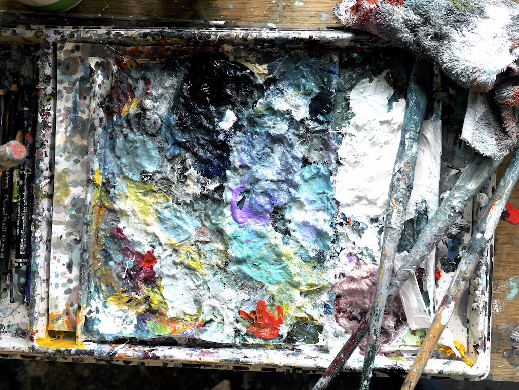 A: Rags. I often use them instead of a brush to wipe away areas to reveal marks and textures. Also, my ridiculously caked paint trayS where my colours get mixed.