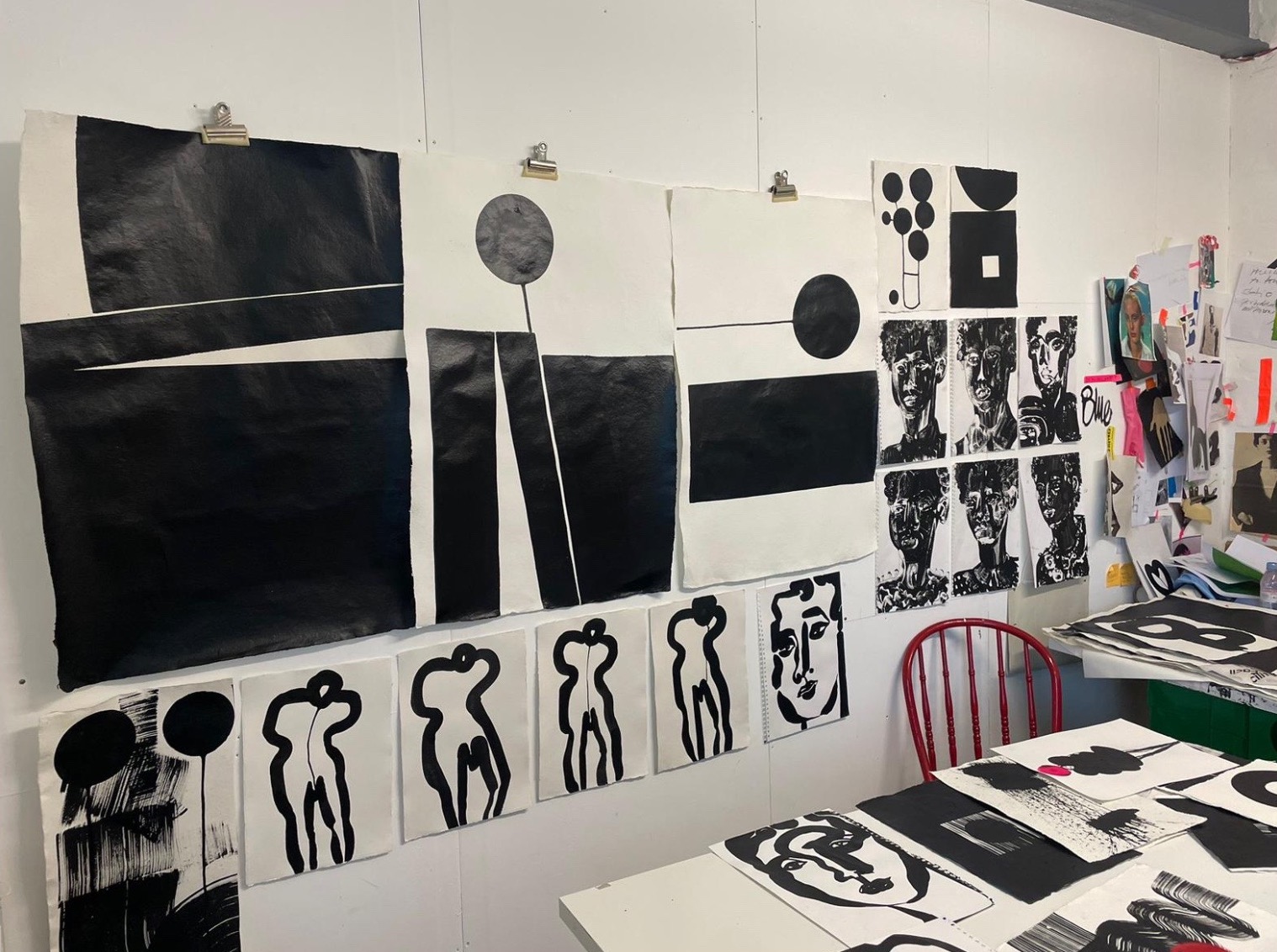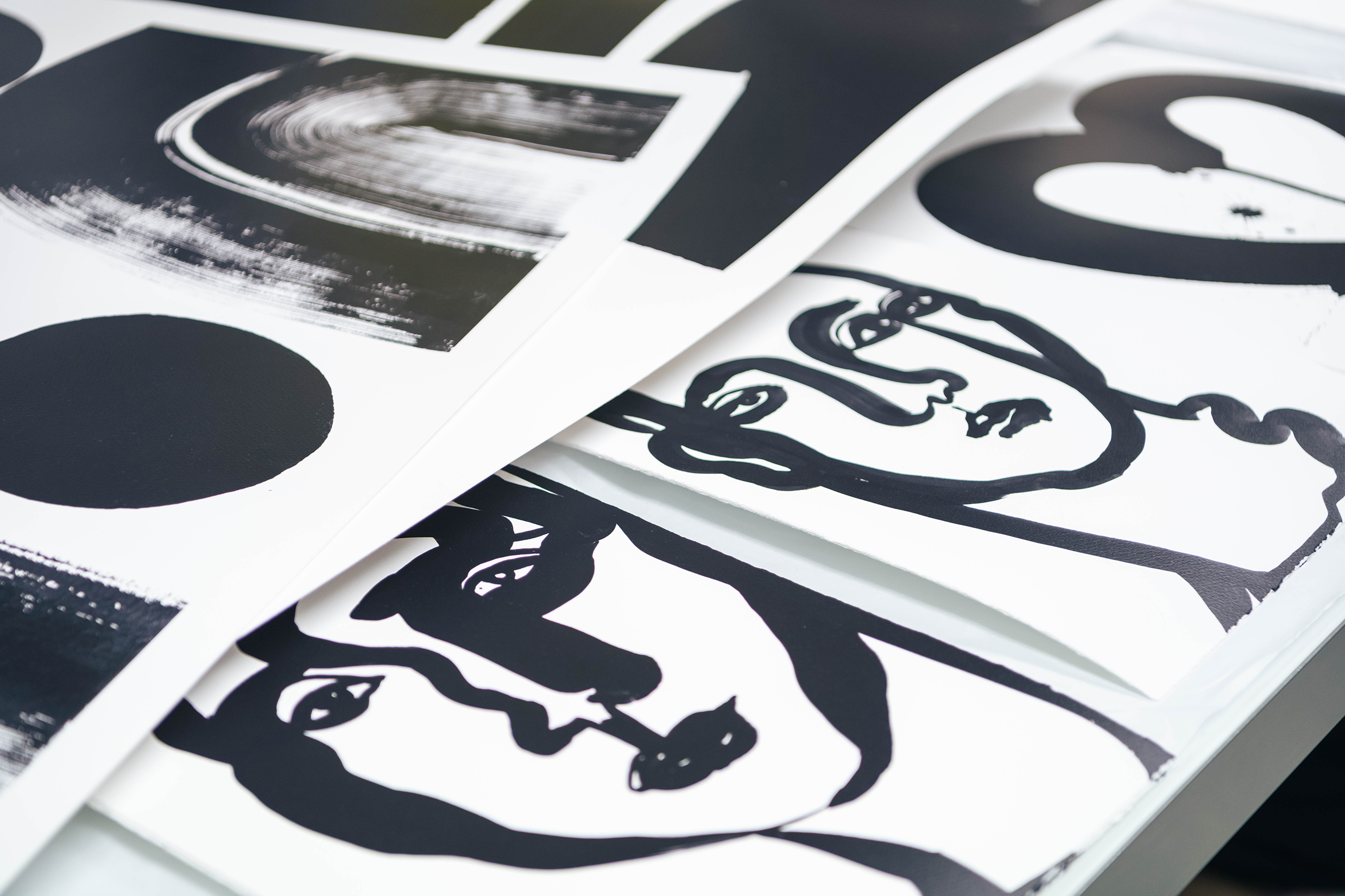 Q: You produce lots of impactful, very gestural black-and-white artworks. How do you decide upon your subject matter?