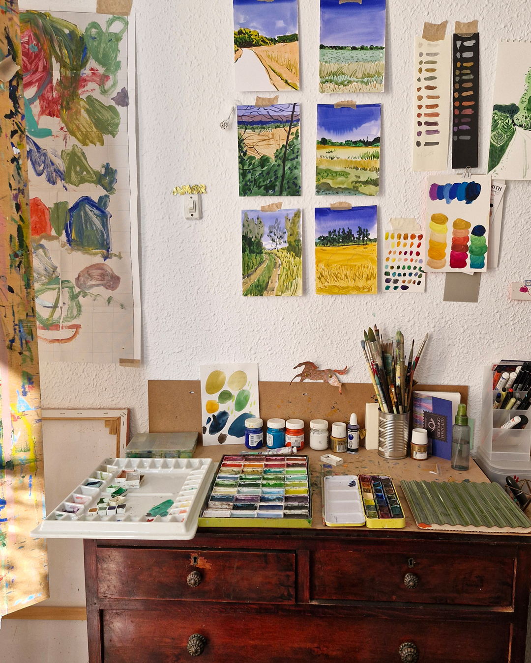 So while my time is split, both practices feed into each other. I use the same skills and creative energy in both, drawing, colour exploration, storytelling. My painting practice complements my design work and vice versa, and I feel lucky to live surrounded by creativity every day.
