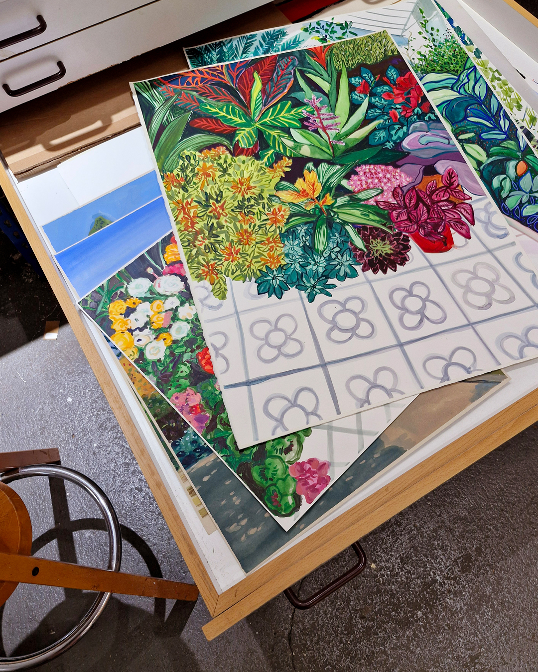 At the same time, I began experimenting more with water-based techniques, which allowed me to work faster and keep the colours fresh and saturated. It suited this new, sunny environment perfectly.