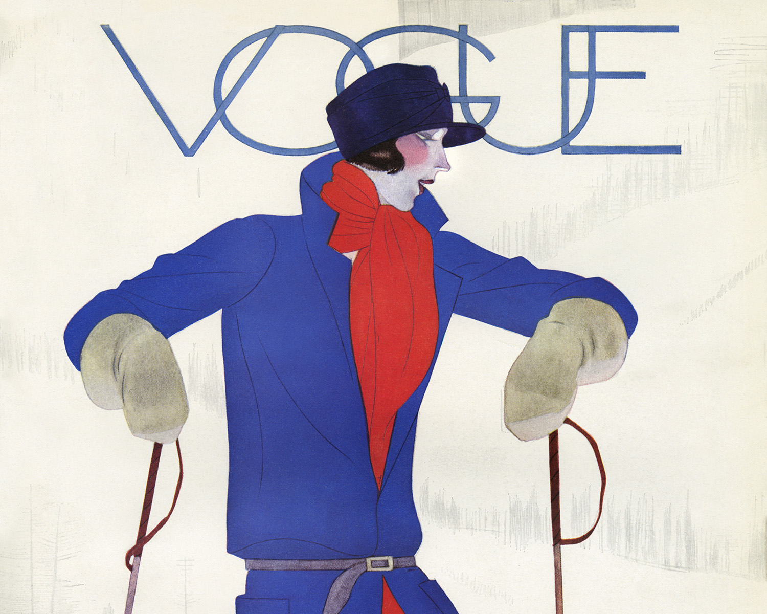 Just like Pierre Mourgue in his illustration, Horst has used a rich combination of blue and red for his shoot. A luxurious two-toned blue painted backdrop sets off the red of the headscarf and matching mittens in the foreground that casually clutch at the skis and poles.