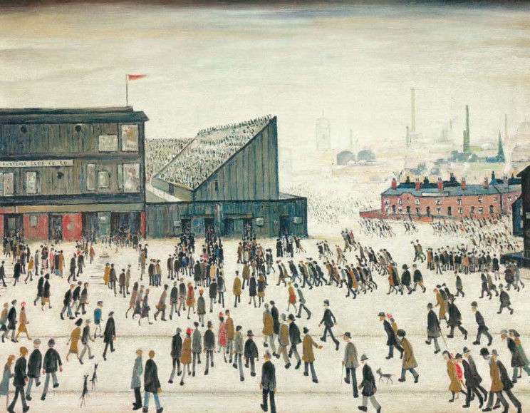 Lowry filled the stands with cheering crowds and positioned them directly in the centre of the painting, capturing the excitement of the match. Red terraced houses and factories, also line the background to accentuate the community aspect of the game.