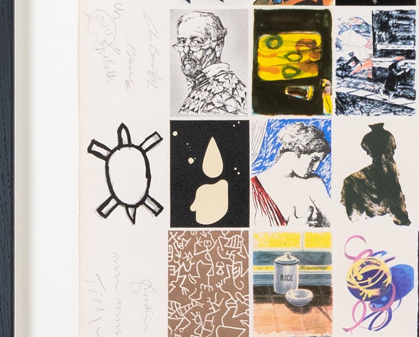 Our rare edition of Visual Aid, which is accompanied by a Certificate of Authenticity, also includes a grid of squares featuring the artists names that can be used as a reference for studying the rest of the artworks on the print.