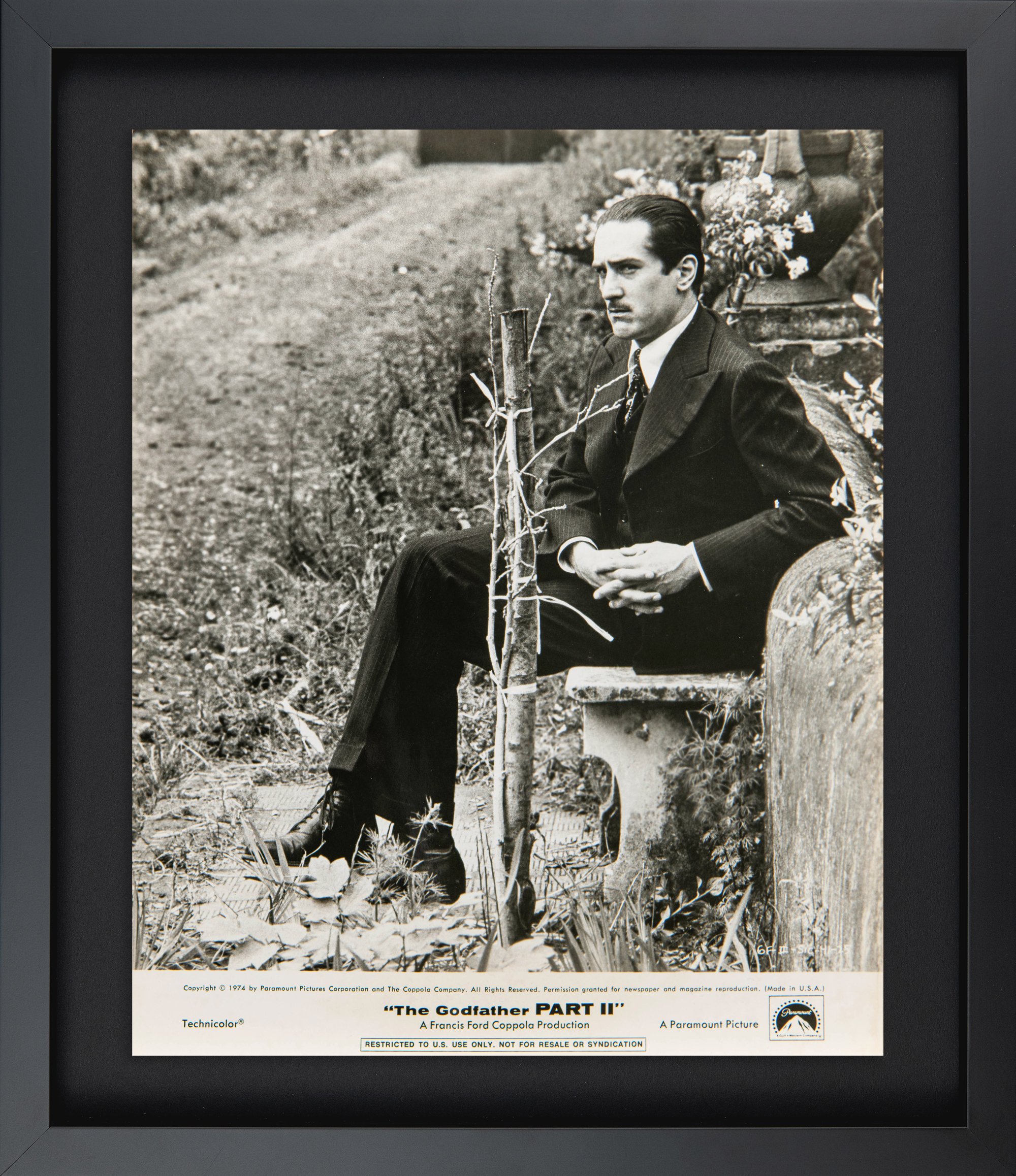 The prequel covers the journey of his father, Don Vito Corleone (Robert De Niro), from his Sicilian childhood to the founding of his family enterprise in New York City. This original film still features De Niro sitting outside on a bench during a visit to his home country of Sicily, contemplating his attack on his rival Don Ciccio.