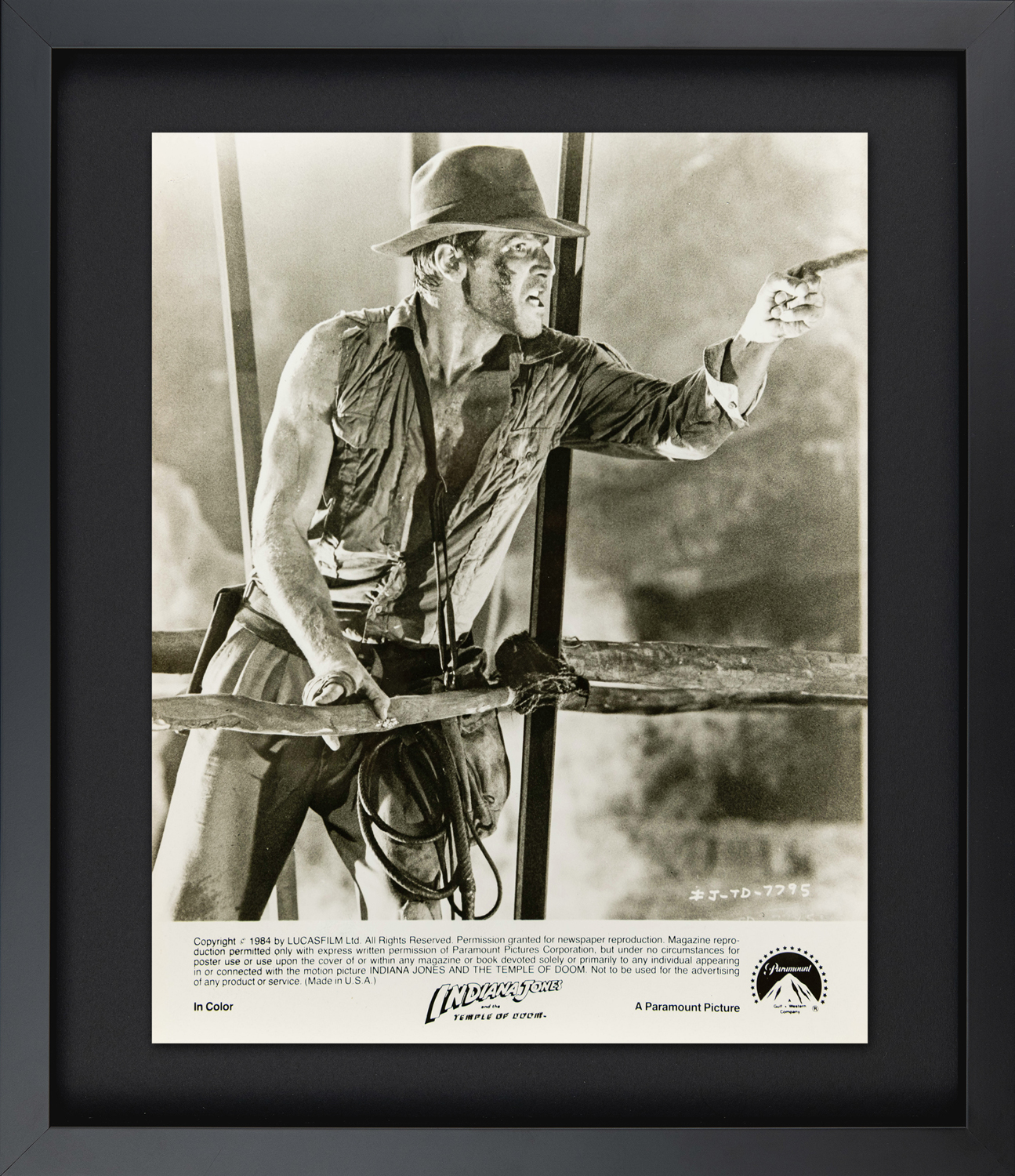 After arriving in India, the archaeological professor is asked by desperate villagers to find a magical stone and rescue their children from a cult. This original film still captures the moment Indiana Jones, played by high profile actor Harrison Ford, escapes from the Temple of Doom.