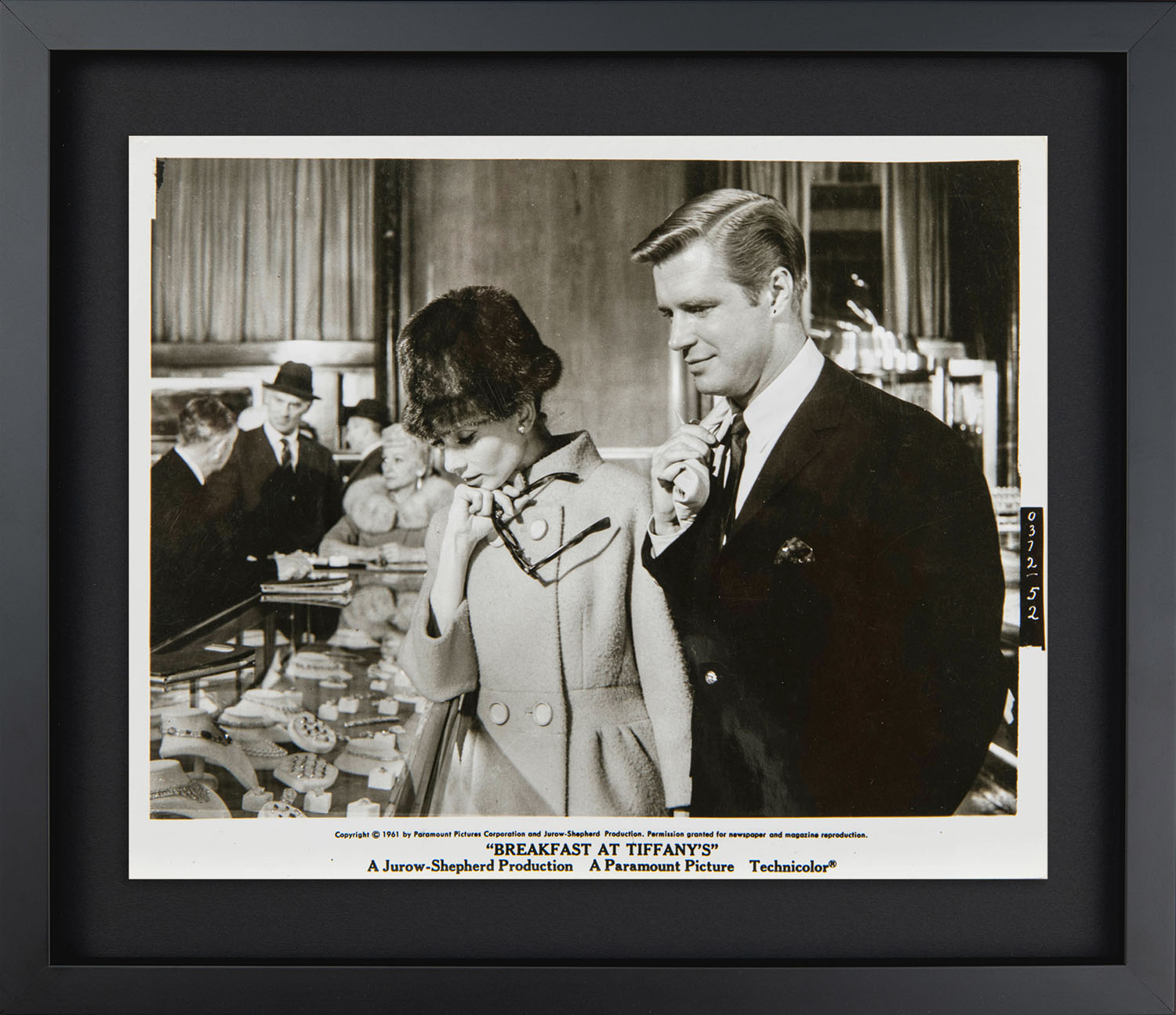This original film still features Hepburn standing next to her co-star browsing for jewellery at the Tiffany & Co. Manhattan flagship store. Hepburn dons a mink Givenchy hat and orange trench coat, one of many iconic outfits from the film.